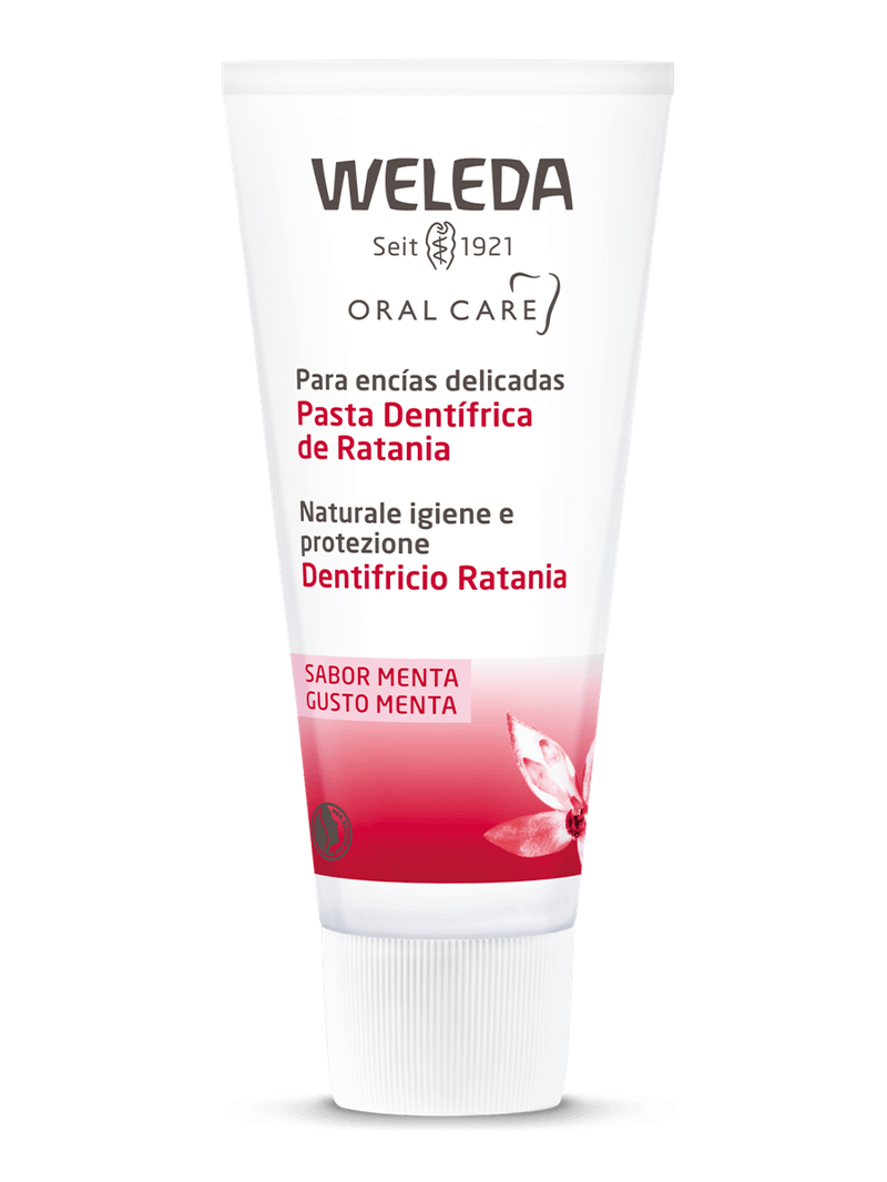 A raiz de Ratânia é tradicionalmente usada pelo povo dos Andes peruanos para limpar seus dentes. Assim como em tudo que a Weleda faz, nós respeitamos essa sabedoria tradicional e a utilizamos para criar produtos que ofereçam cuidados naturais para sua saúde. A robusta raiz vermelha é rica em agentes taninos que auxiliam na proteção e fortalecimento das gengivas doloridas... Com escovação regular, ajuda a prevenir a placa bacteriana e garante a proteção contra as cáries. Nós adicionamos as propriedades calmantes da Mirra e refrescância dos óleos essenciais de Menta e Hortelã, com agentes de limpeza à base de cálcio para criar o Creme Dental de Ratânia da Weleda.